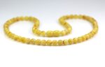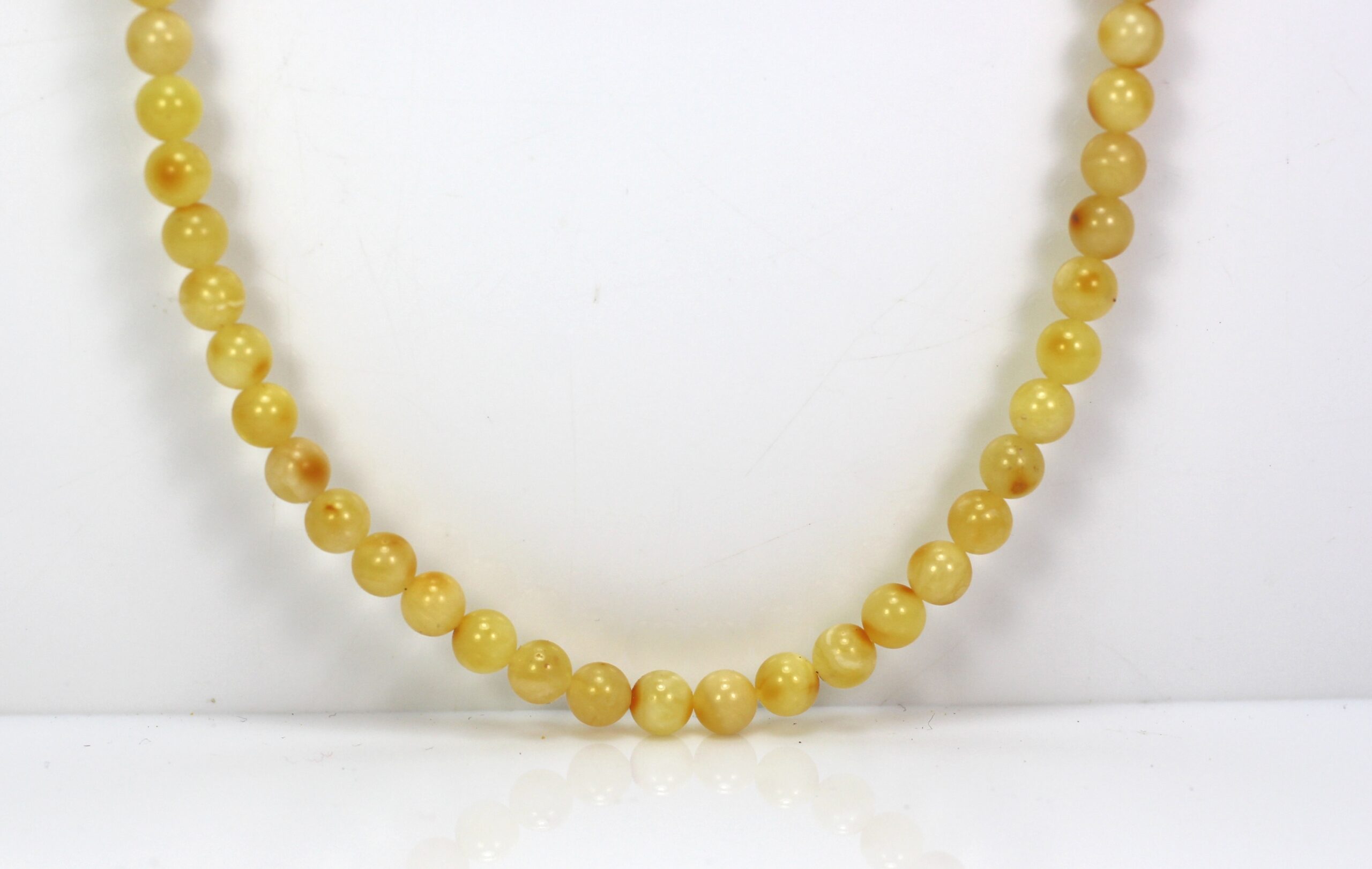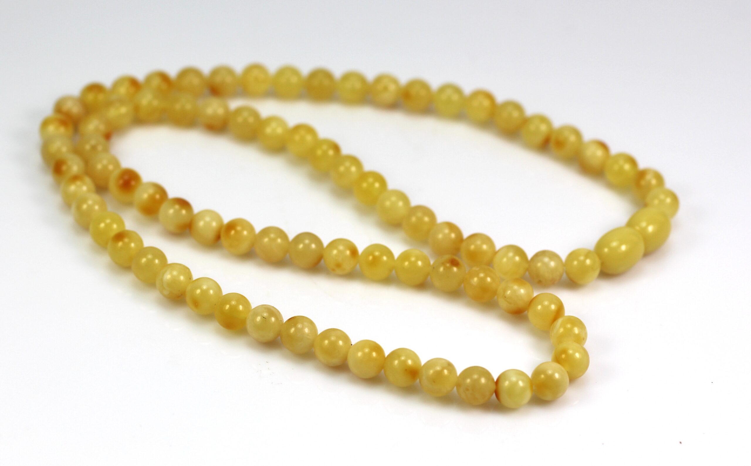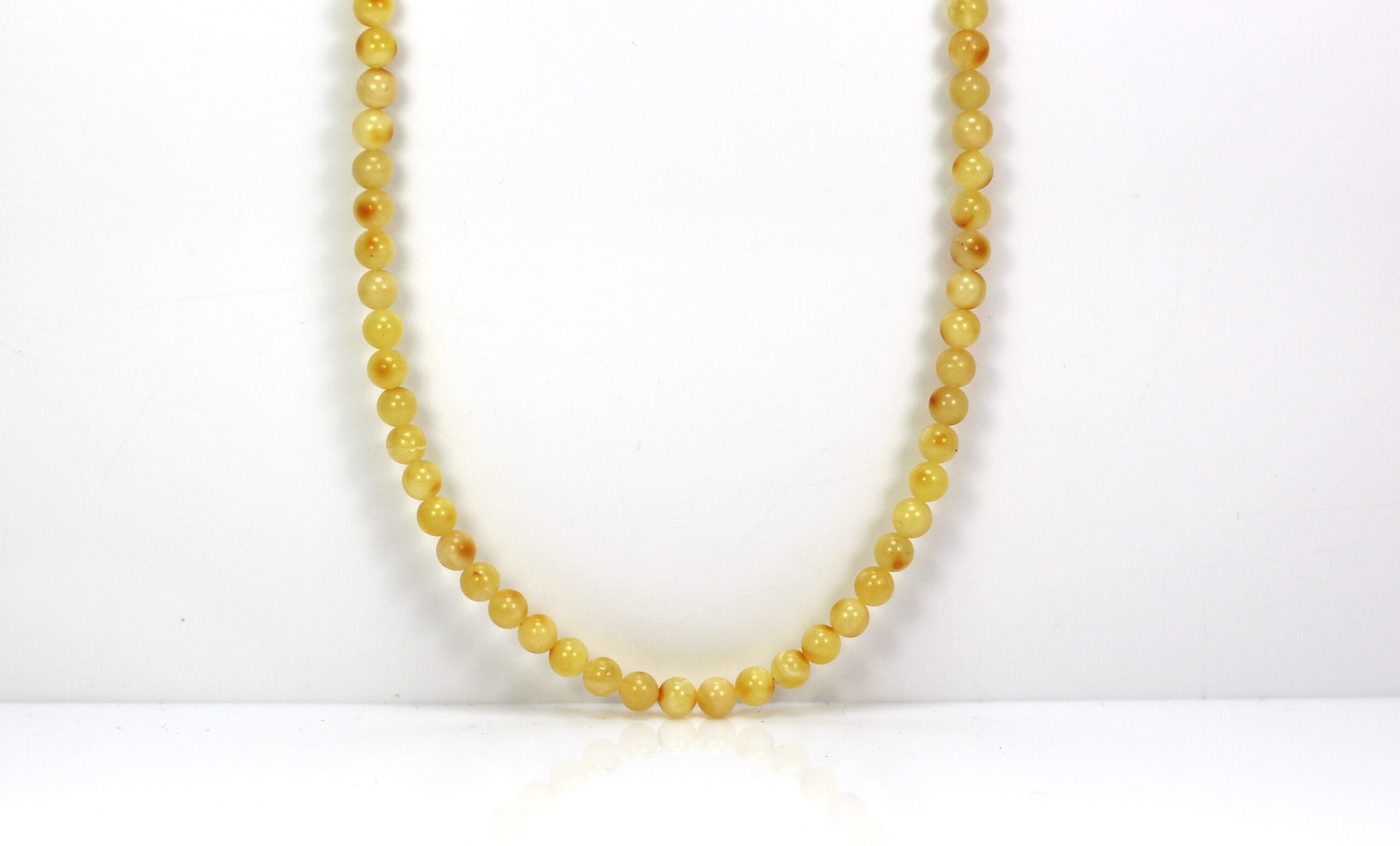 Karoliai pagaminti iš natūralaus Baltijos gintaro. Kiekvienas rutuliukas idealiai apvalus, vienodo diametro ~5,5 mm. Visi karoliukai išskirtinės, retos baltos spalvos.