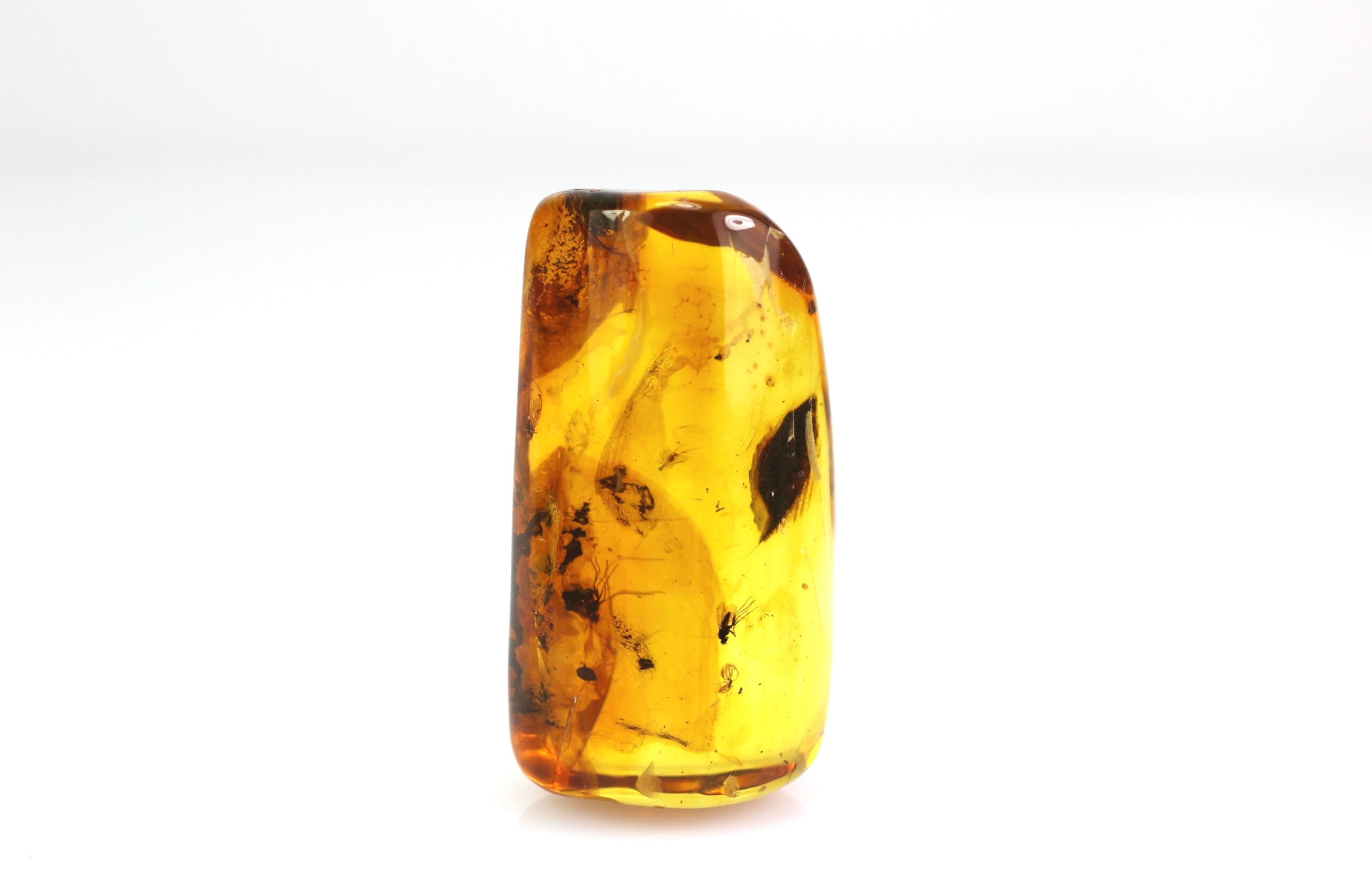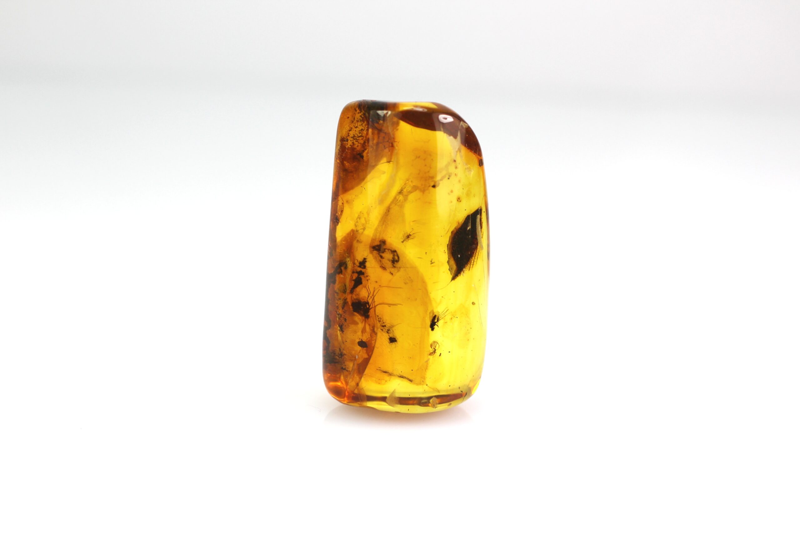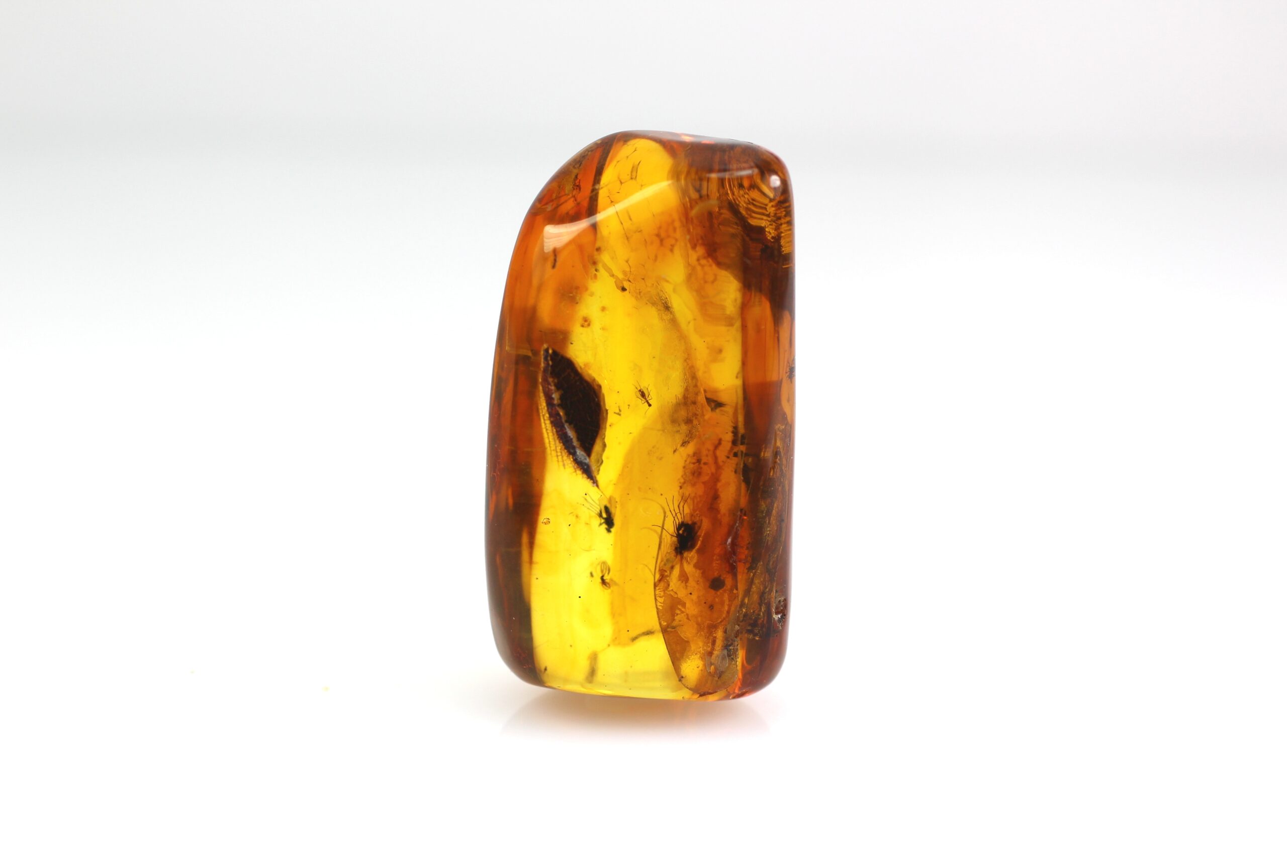 - Tai natūraliai gintaro gabale įstrigusių keli inkliuzai. Pats gabaliukas skaidrus, visi inkliuzai labai gerai matomi. gabaliukas, apdirbtas, stačiakampio formos.