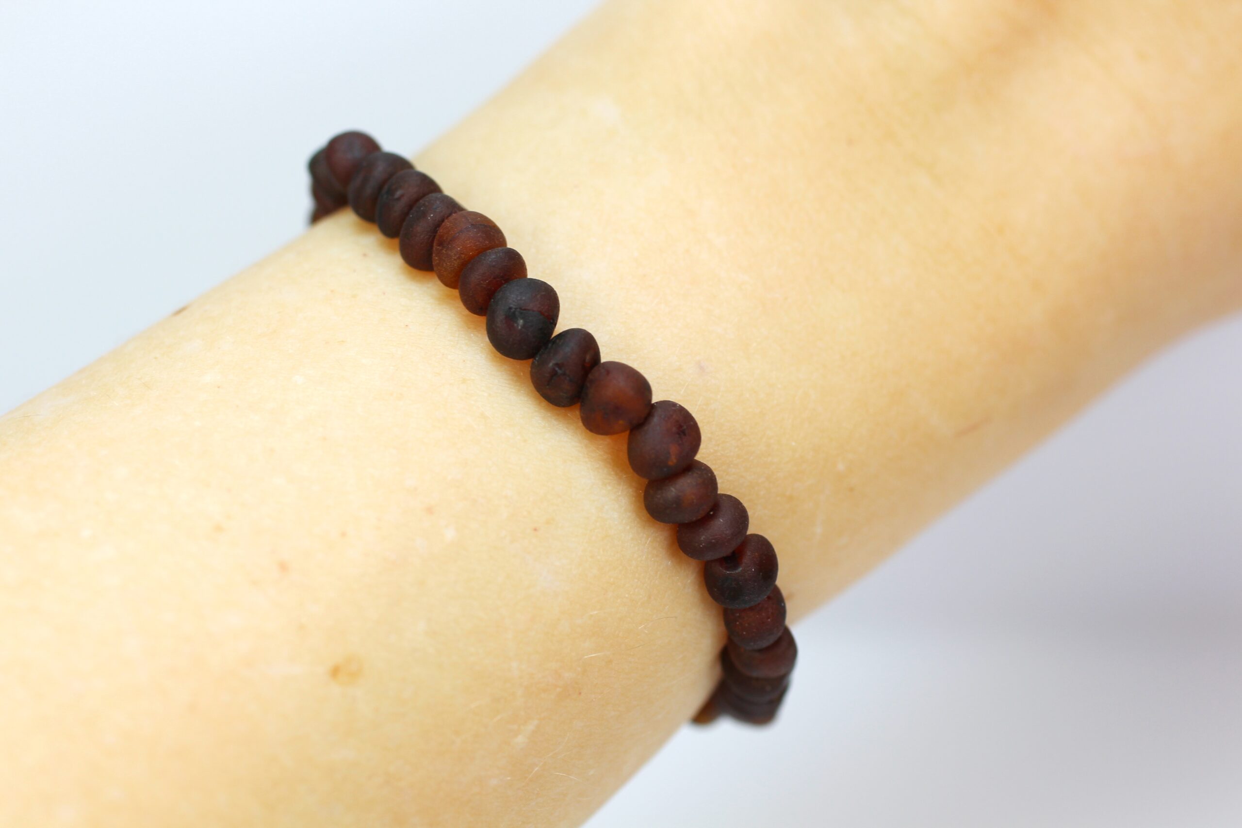 Gintarinė apyrankė pagaminta is natūralaus Baltijos gintaro. Gintaro gabaliukai visi dailiai apdirbti, apvalūs, nepoliruoti. Apyrankė tamsios/vyšninės gintaro spalvos, smulki, moderni ir stilinga.