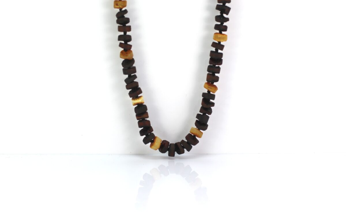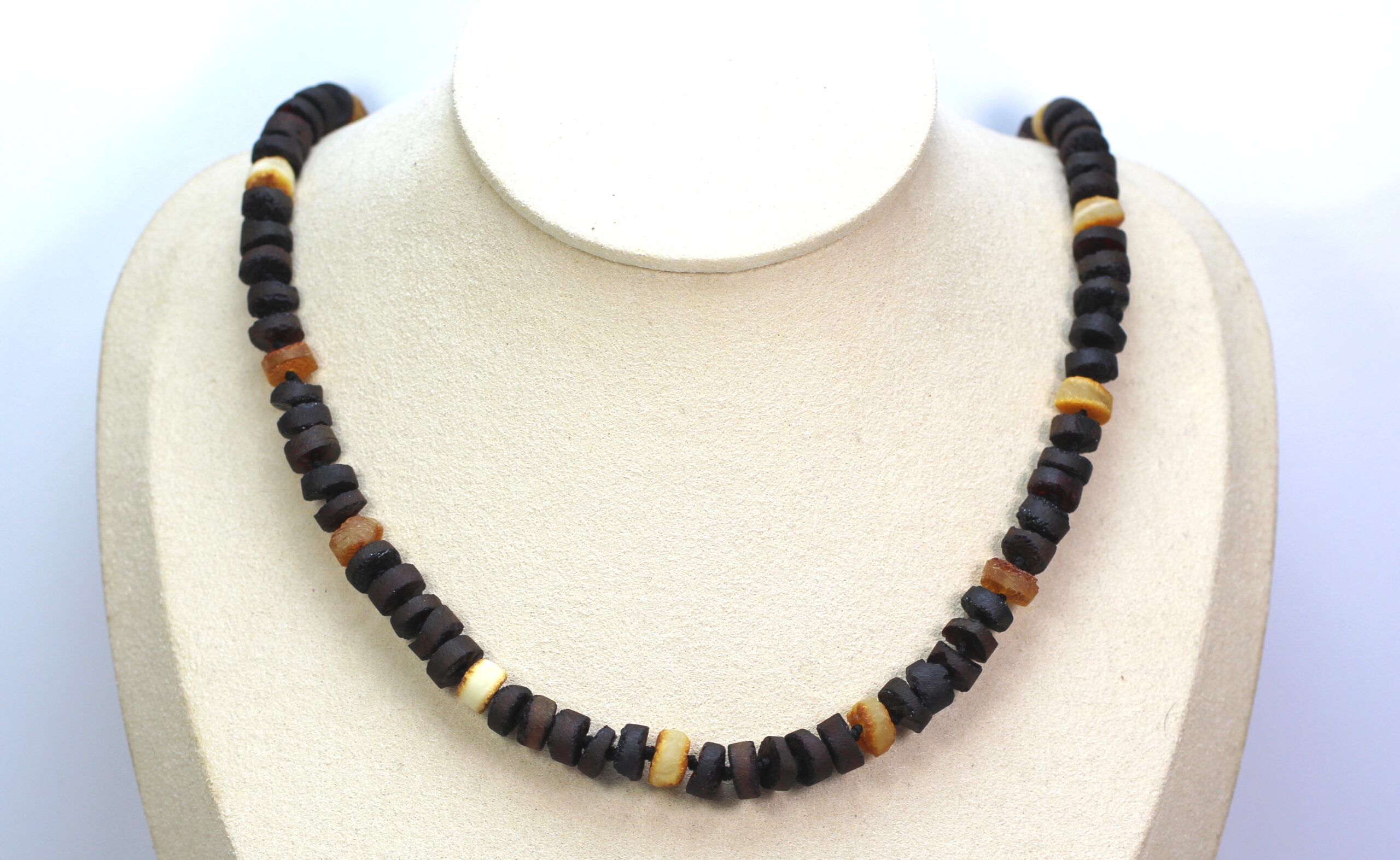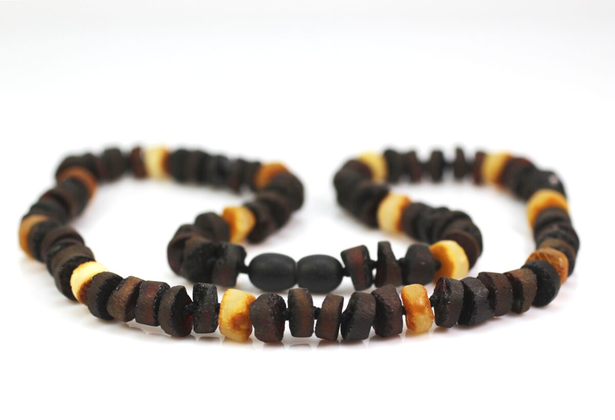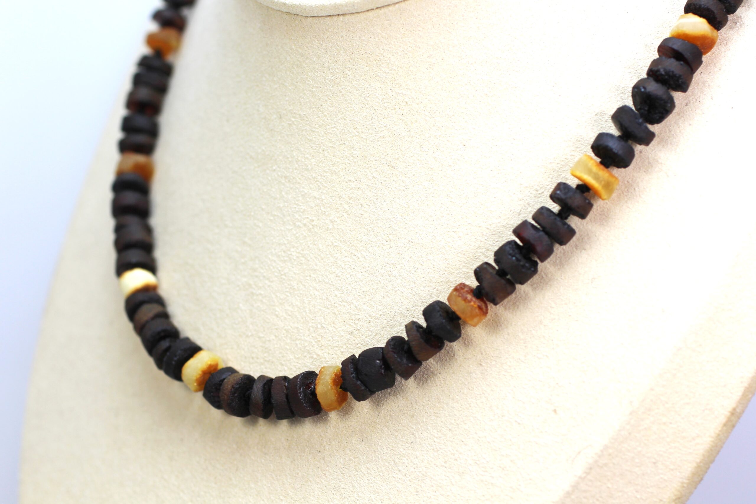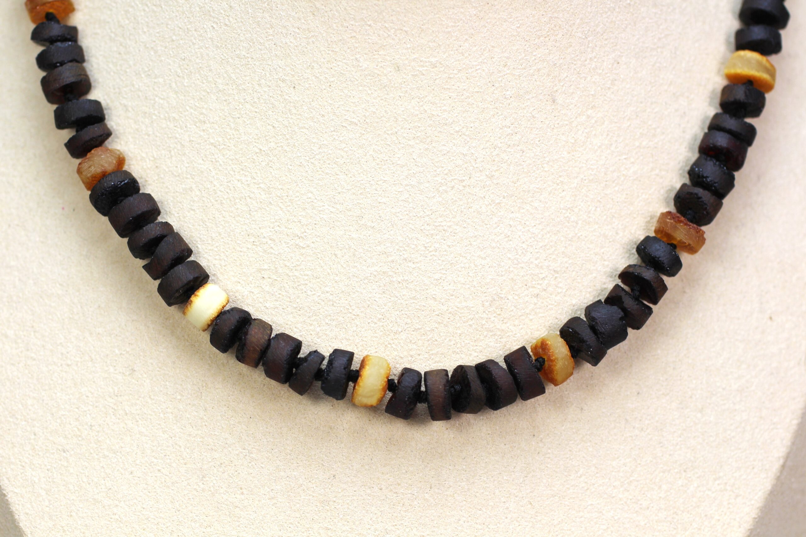 Gintariniai vyriški karoliai pagaminti iš natūralus Baltijos gintaro. Gintaro gabaliukai apdirbti cilindro formos paliekant šiek tiek natūralumo. Nepoliruoti, juodos gintaro spalvos.