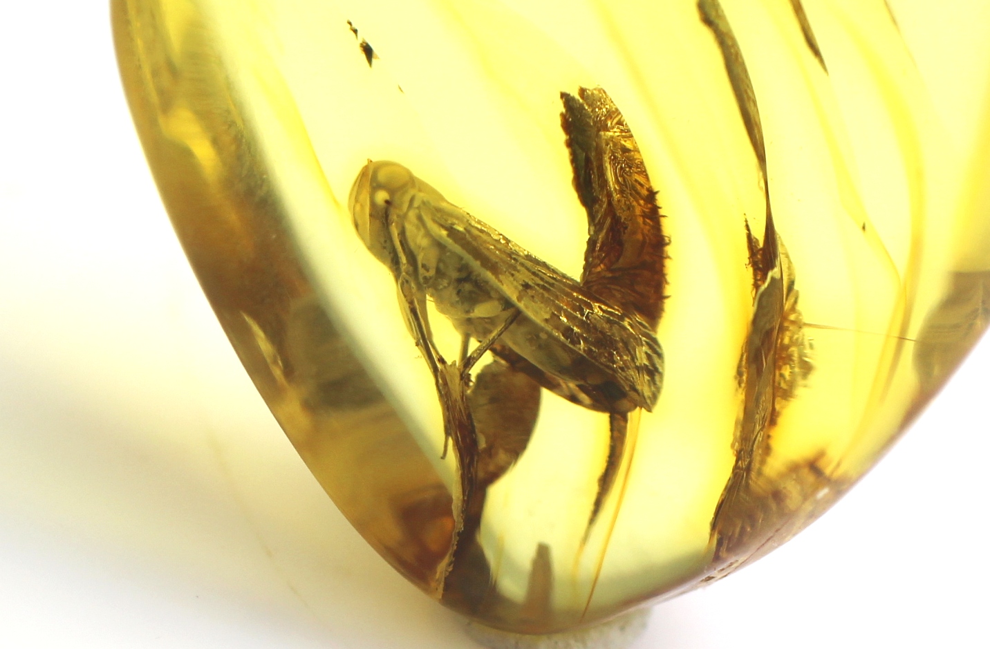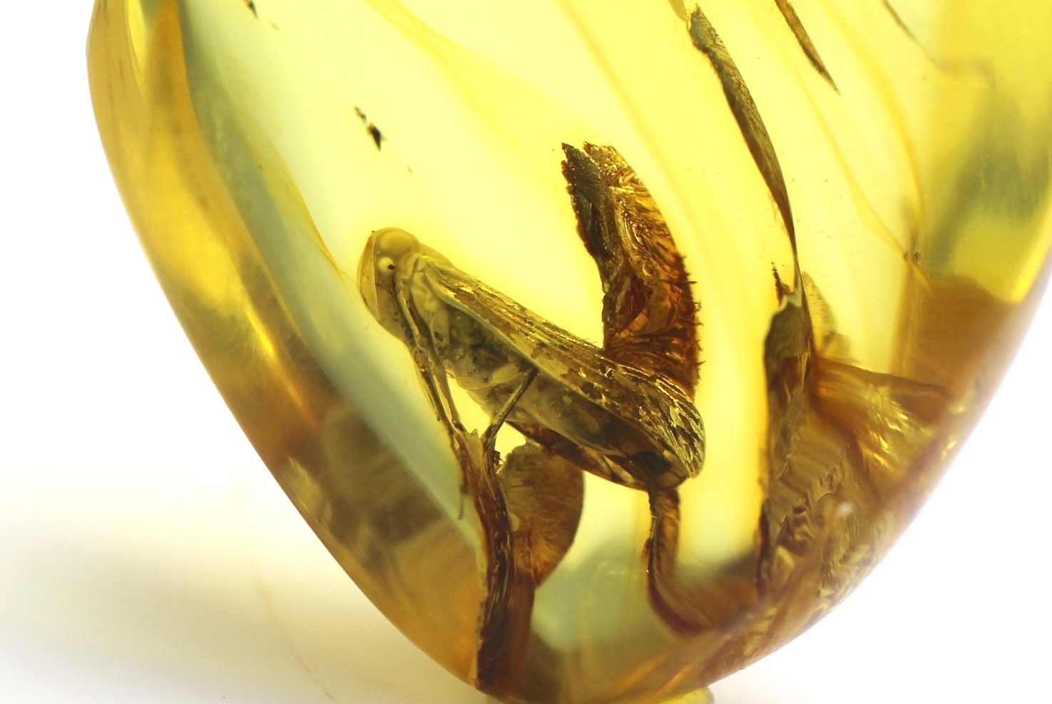 Pakabukas pagamintas iš natūralaus Baltijos gintaro su cikados inkliuzu. Pats pakabukas beveik skaidrus, inkliuzas gerai matosi. Gintaro gabaliukas pailgos formos.