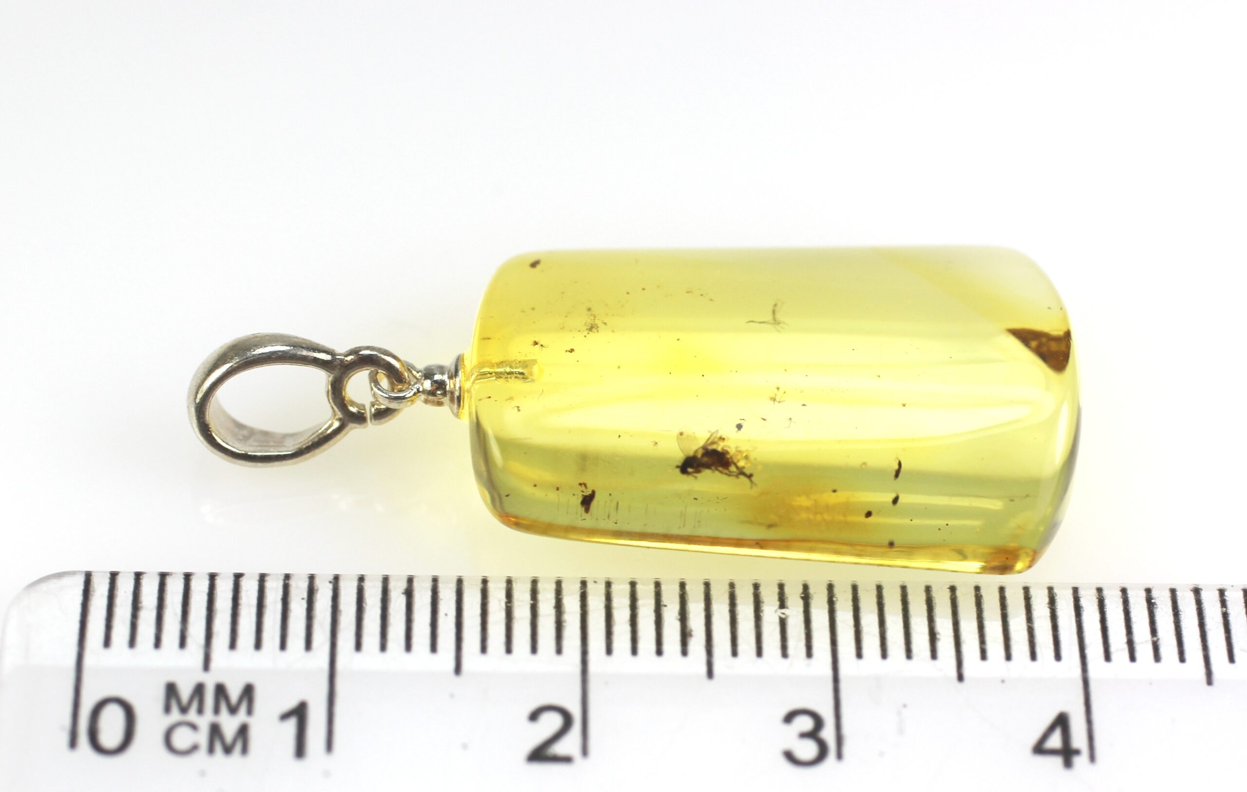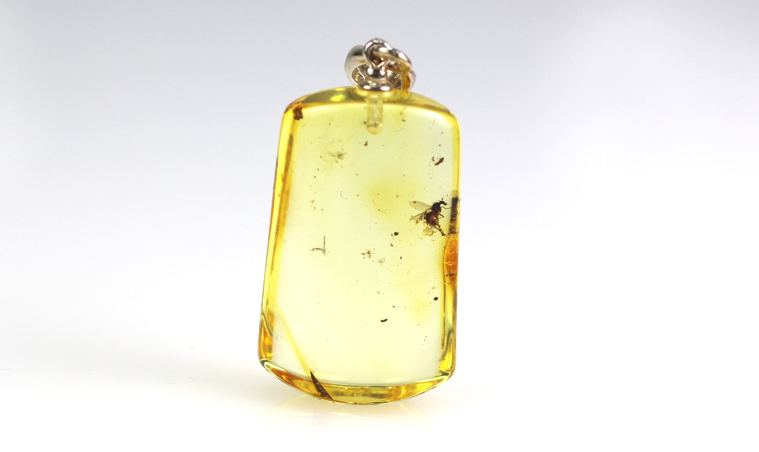 • Pakabukas pagamintas iš natūralaus Baltijos gintaro su musės inkliuzu. Pats pakabukas visiškai skaidrus, inkliuzas šiek tiek šone, bet labai  gerai matosi. Gintaro gabaliukas stačiakampio formos.