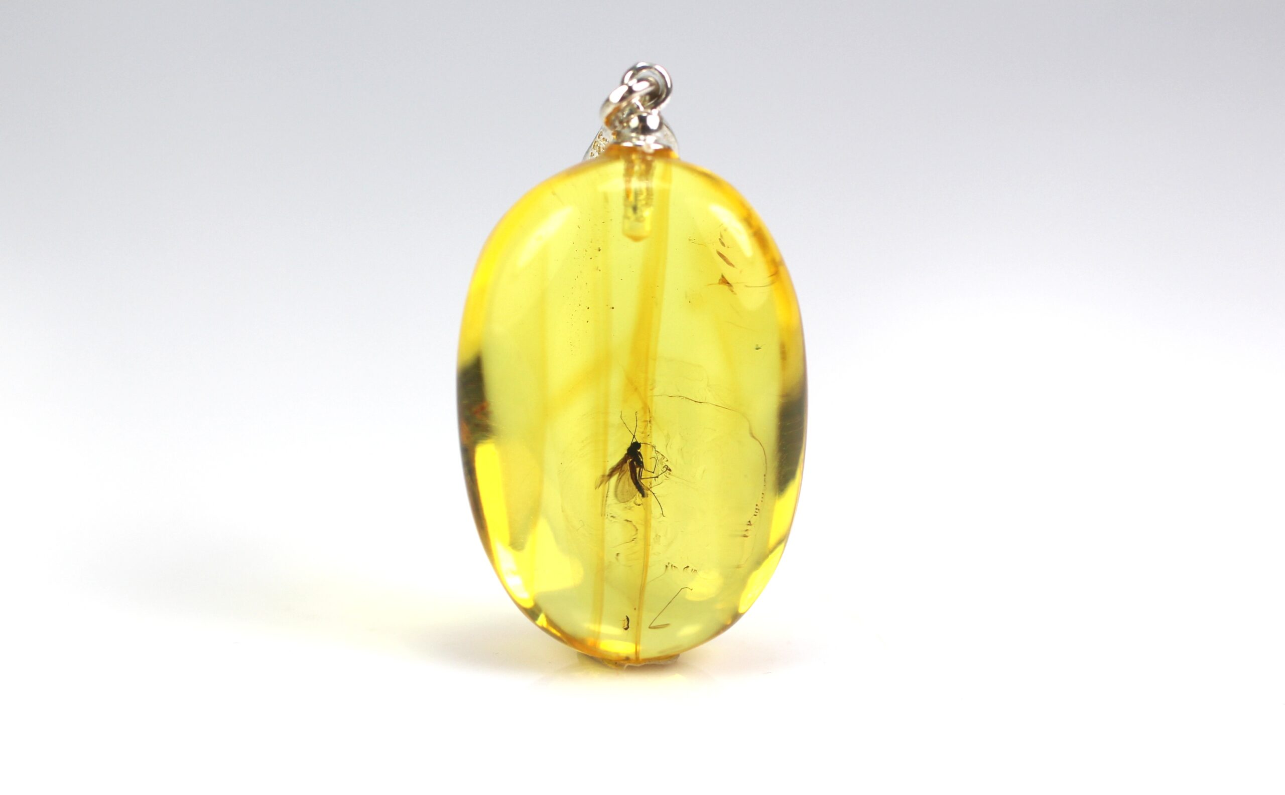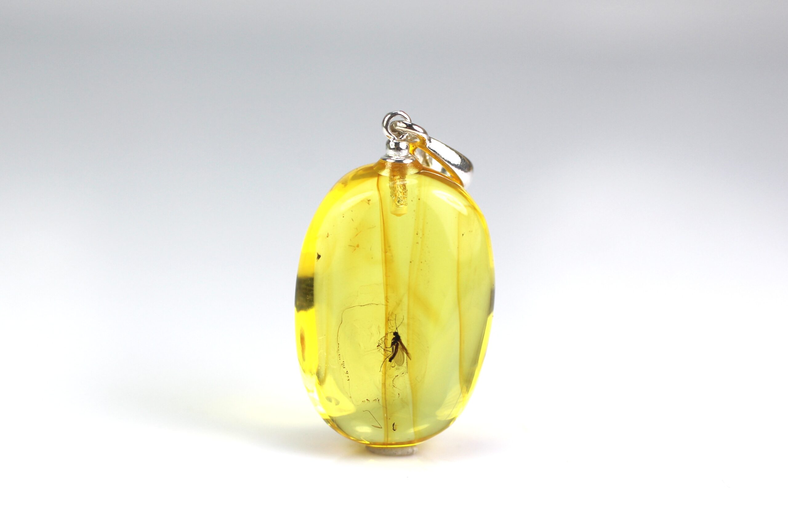 • Pakabukas pagamintas iš natūralaus Baltijos gintaro su uodo inkliuzu. Pats pakabukas skaidrus, inkliuzas gerai matosi. Gintaro gabaliukas pailgos formos.