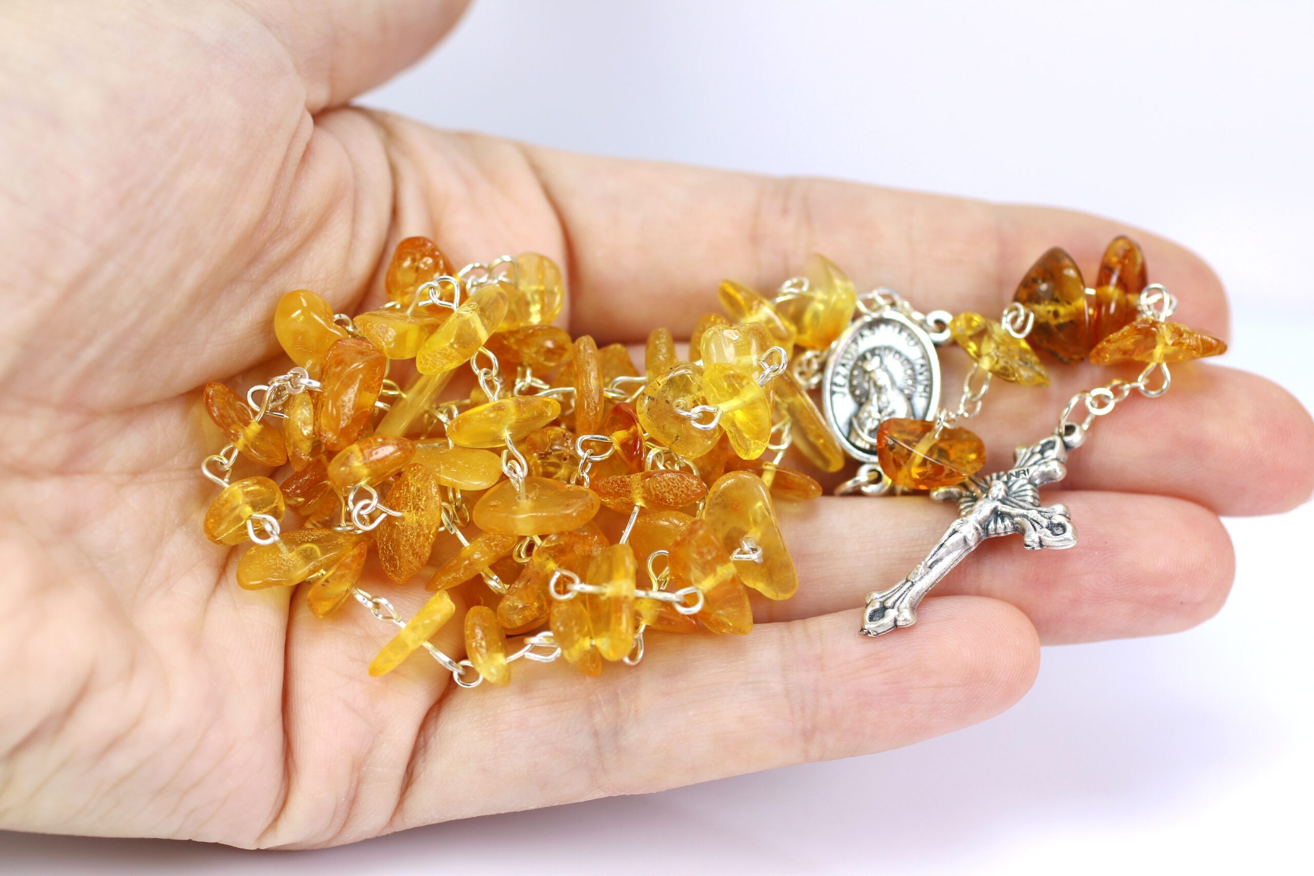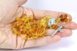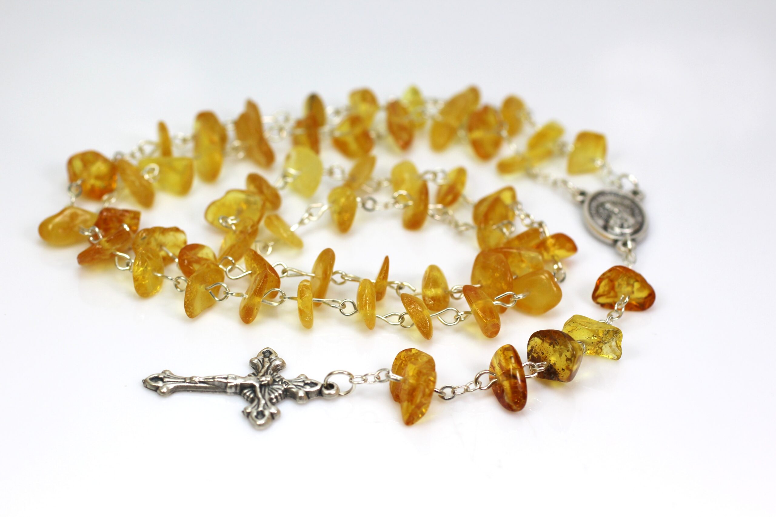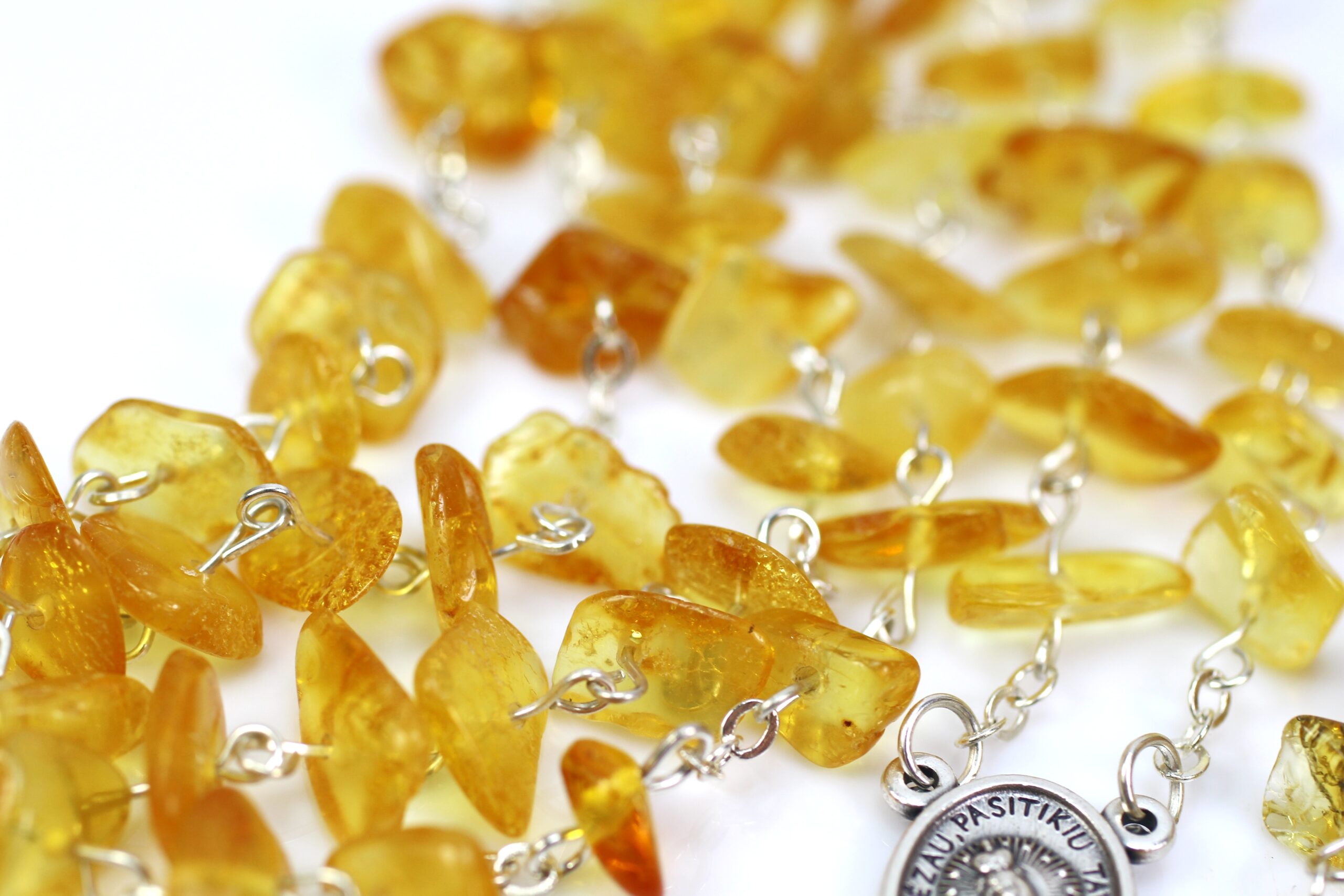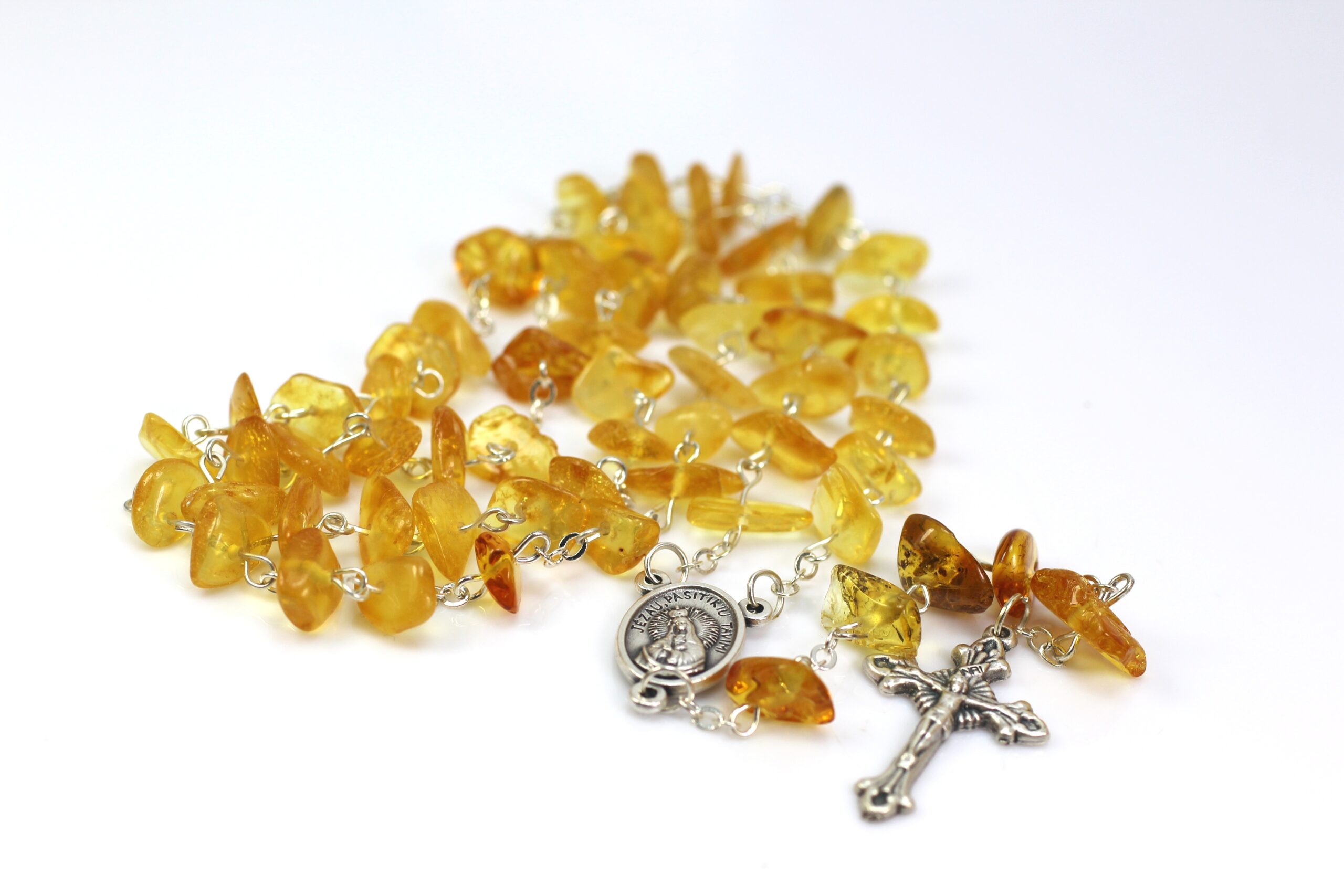 • Tai natūralaus, aukštos kokybės, gintarinis rožančius. Geltonos, Baltijos gintaro spalvos. Visos metalinės detalės iš nerūdijančio plieno. Gintaro rožančius puiki  dovana krikštynų, pirmosios Komunijos ar kitoms progomis.