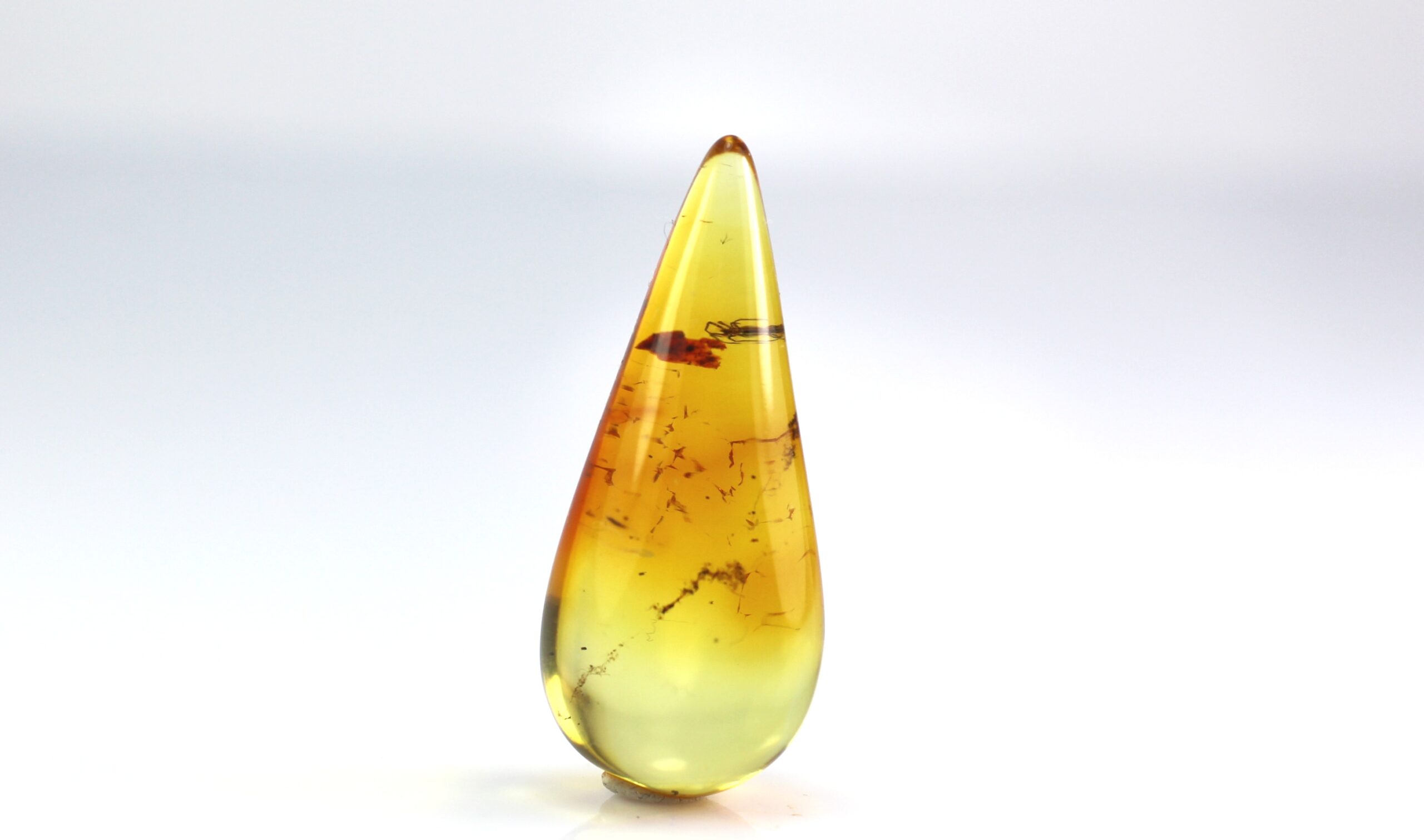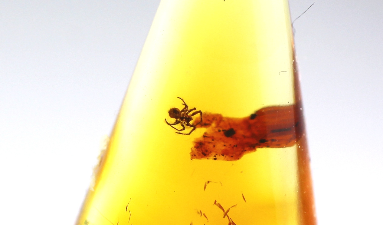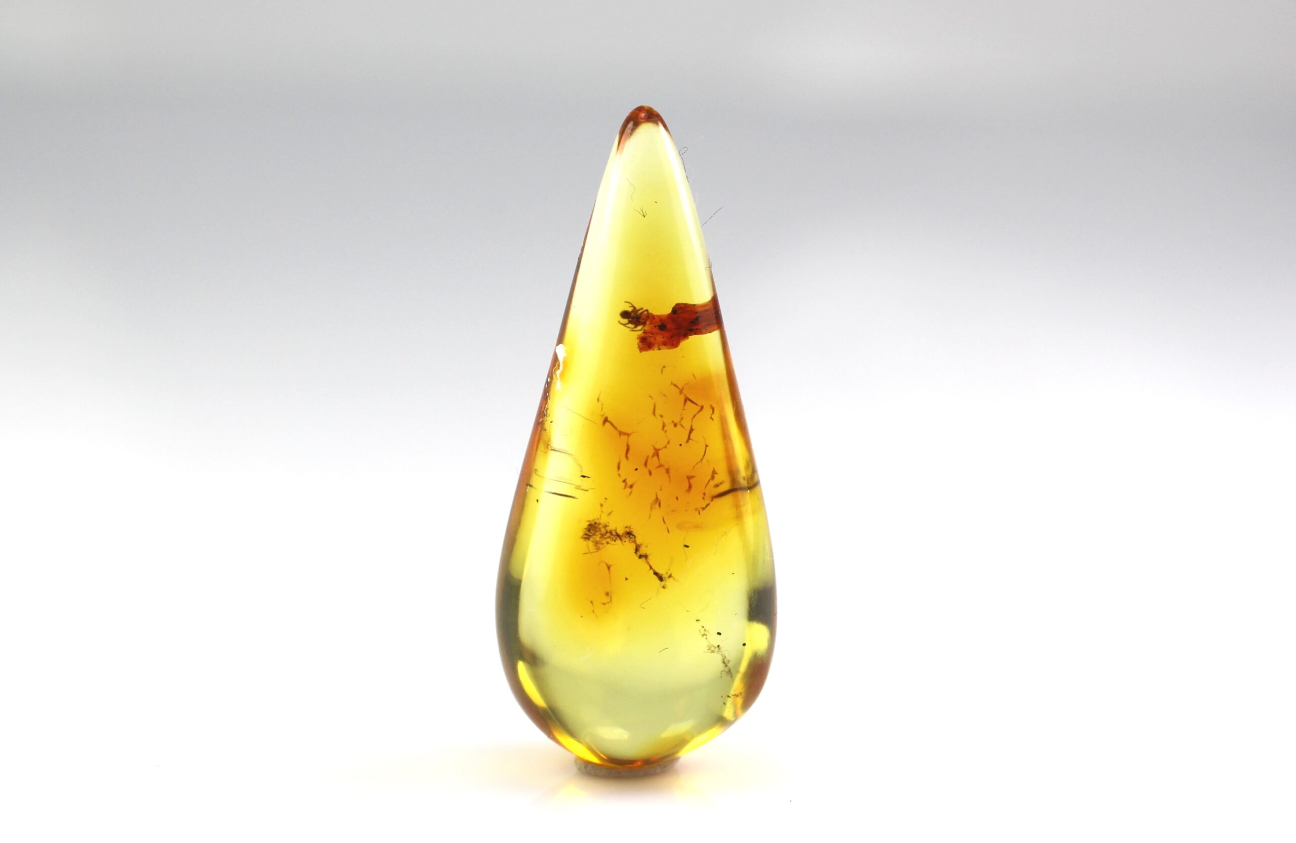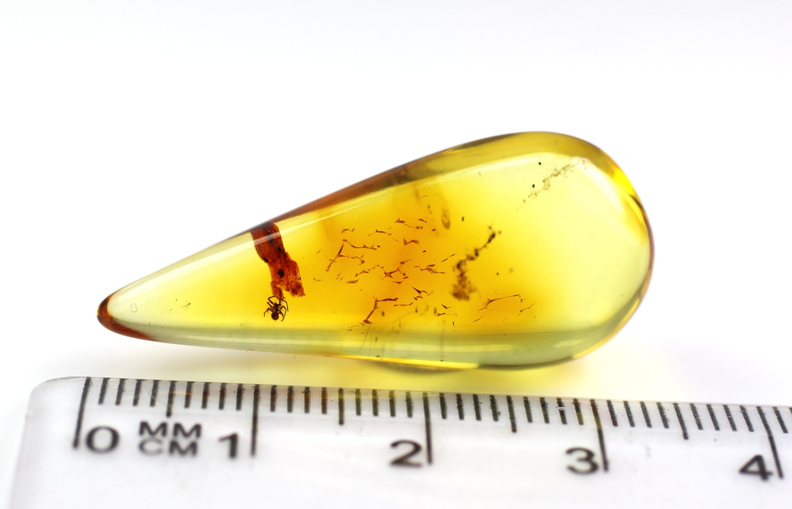 Tai natūraliai gintaro gabale įstrigęs mažo voro inkliuzas. Voro inkliuzas mažas, bet labai gerai matomas. Pats gabaliukas beveik skaidrus, ovalo/lašo formos.