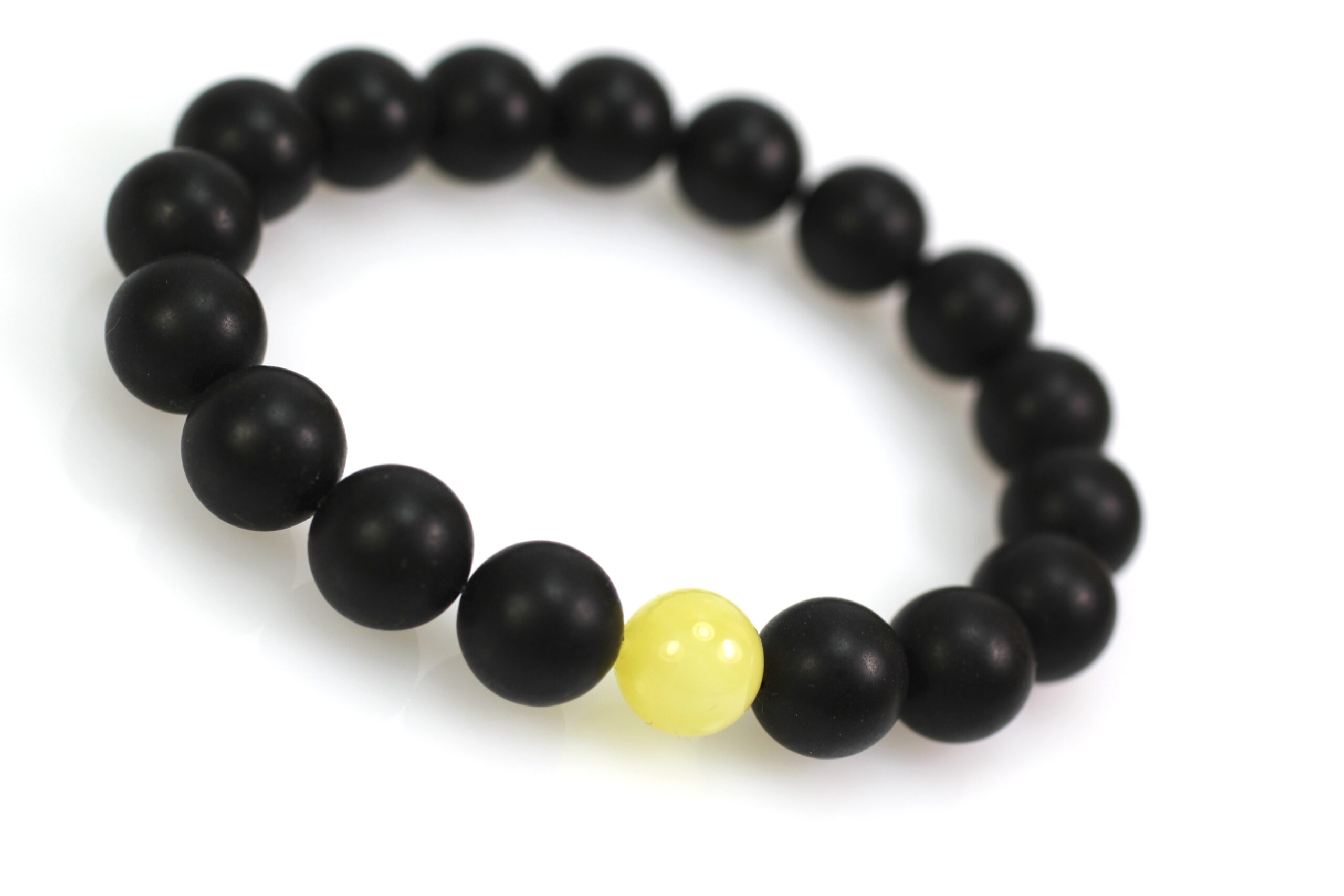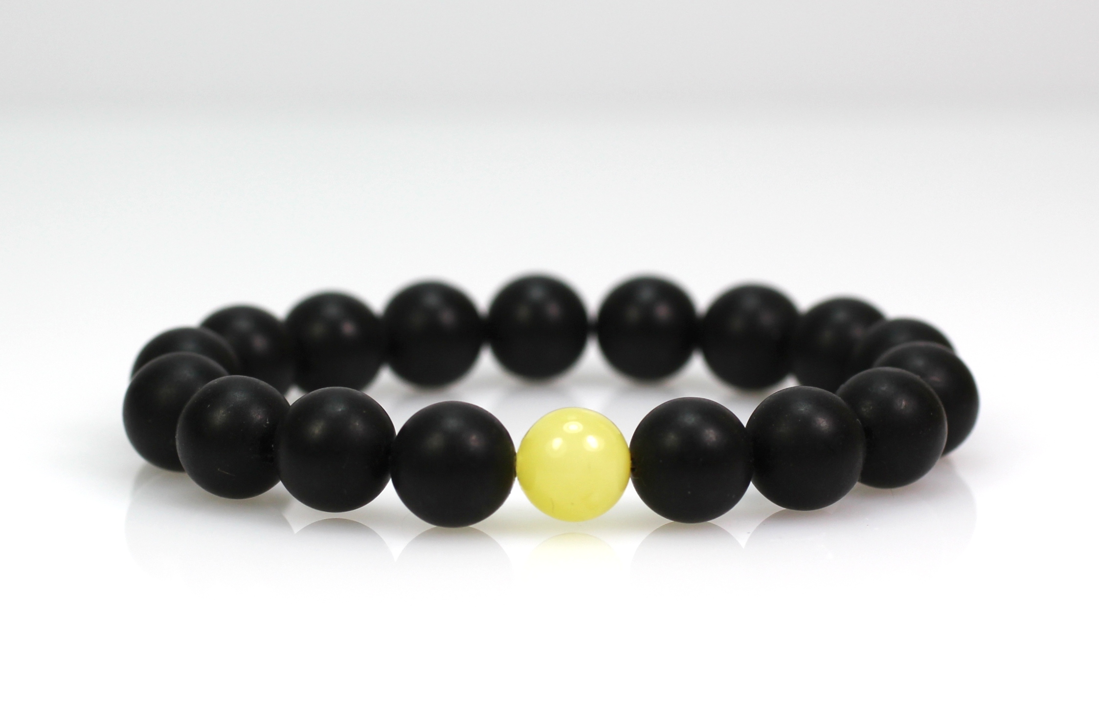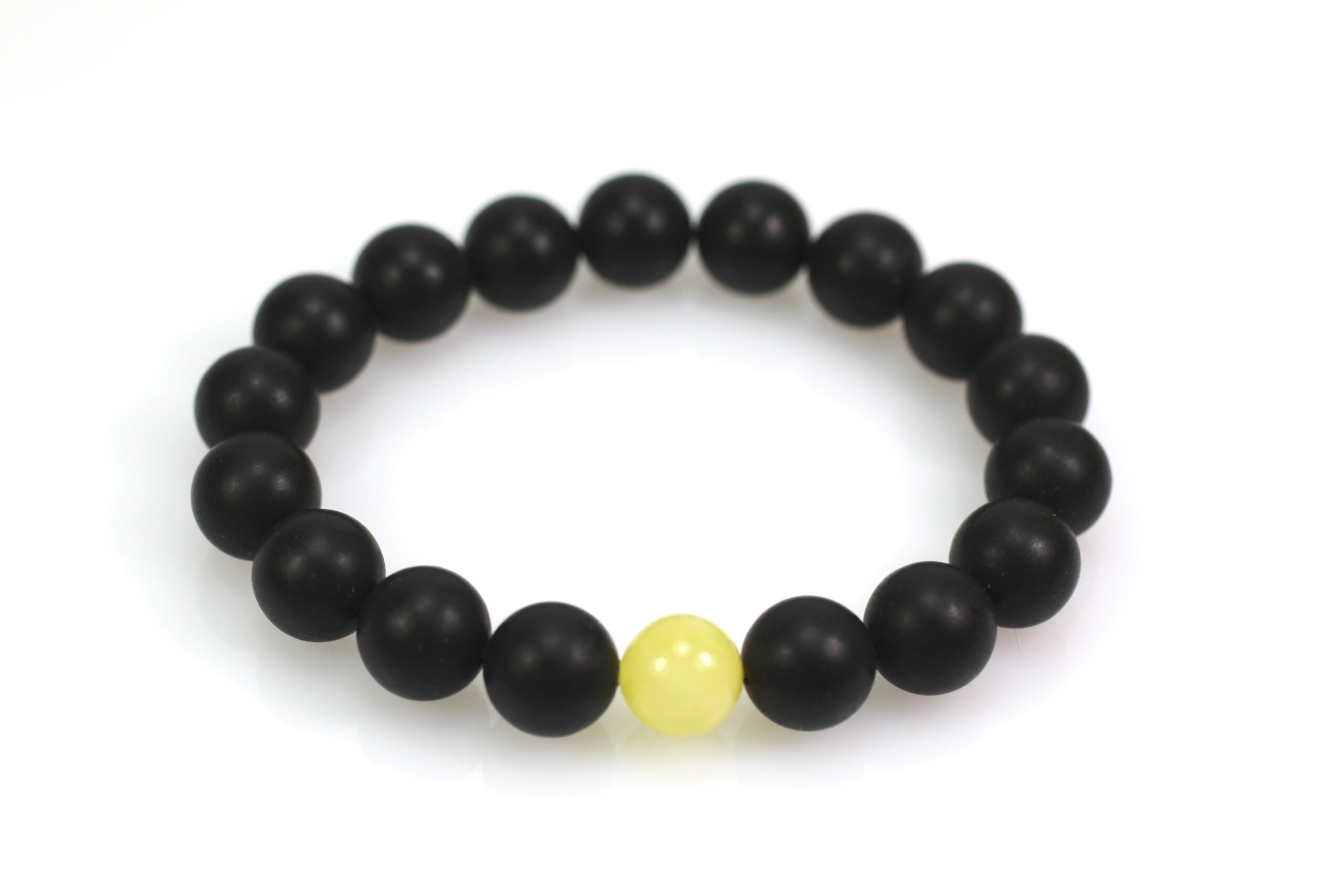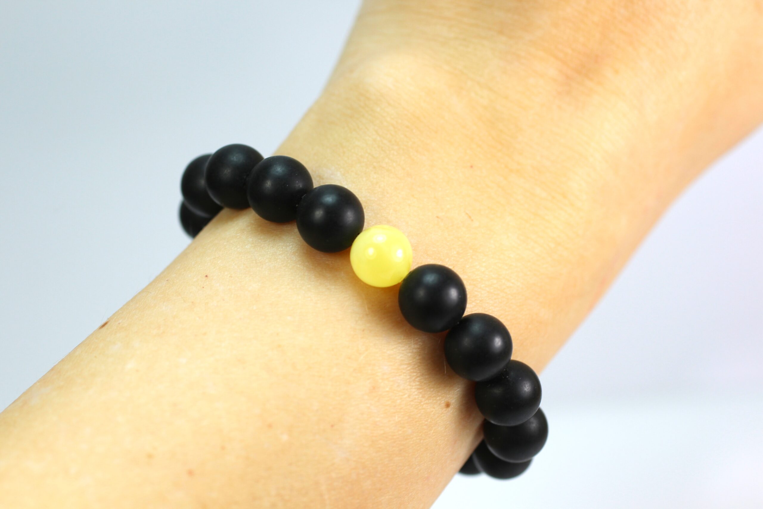 Juodo gintaro apyrankė pagaminta iš presuoto Baltijos gintaro. Gintaro rutuliukai visi dailiai apdirbti, idealiai apvalios formos, 10 mm diametro. Gintaro rutuliukai nepoliruoti, vienas geltonas rutuliukas centre. Apyrankė moderni ir stilinga.